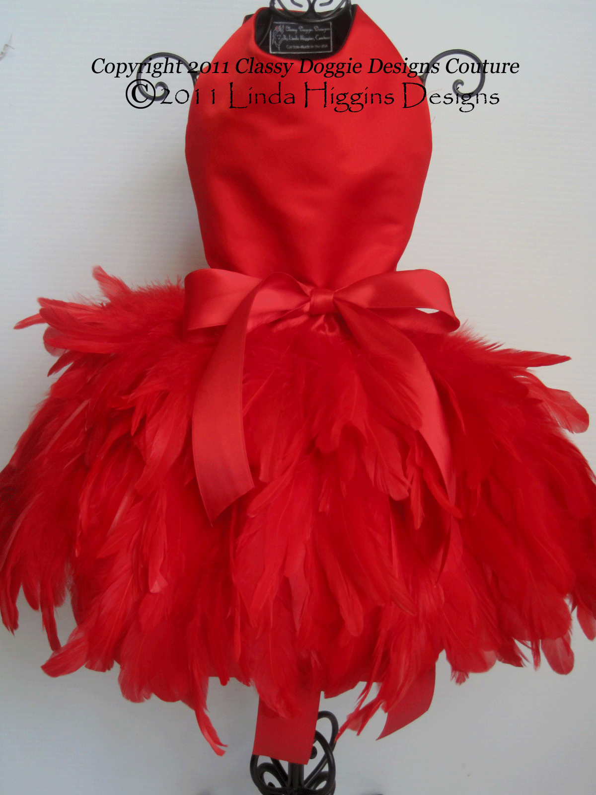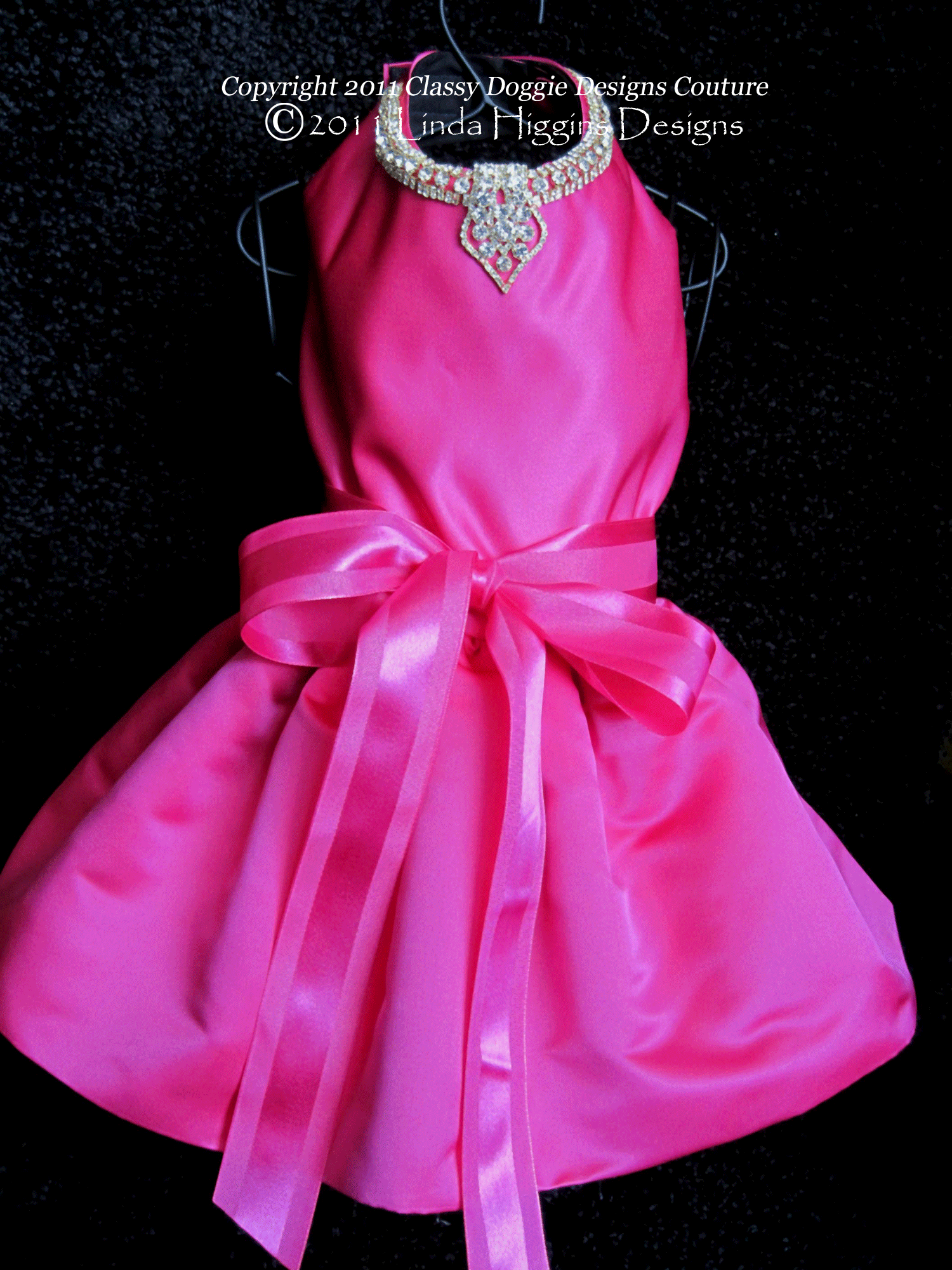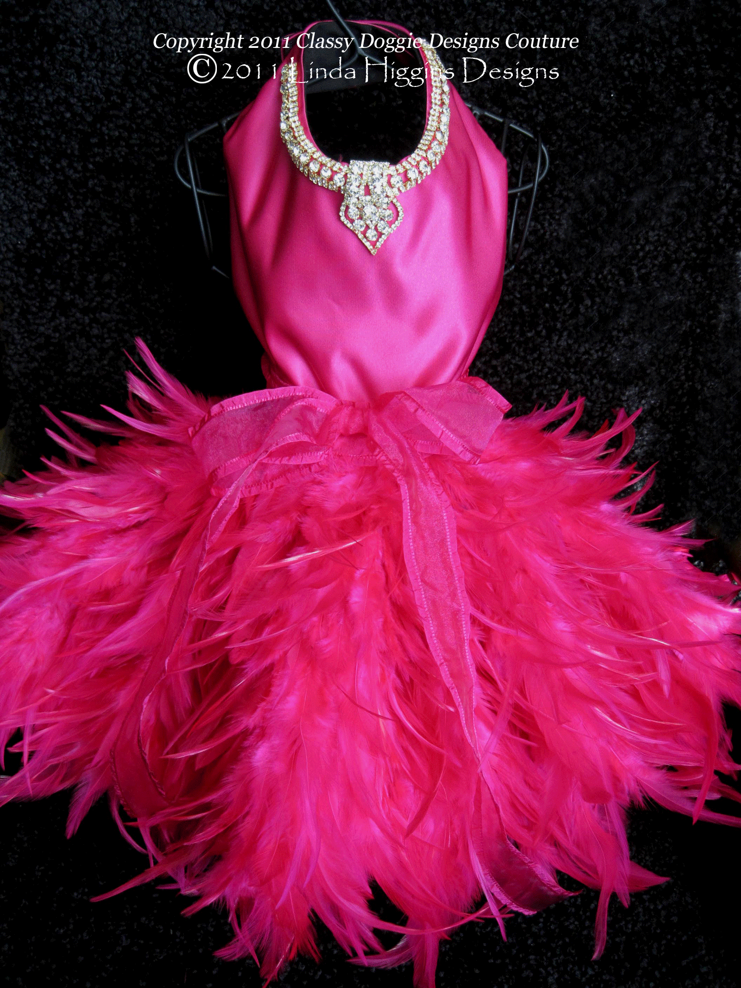 Hot pink satin dress with tie on feather skirt. Jeweled neckline, imported fabric.